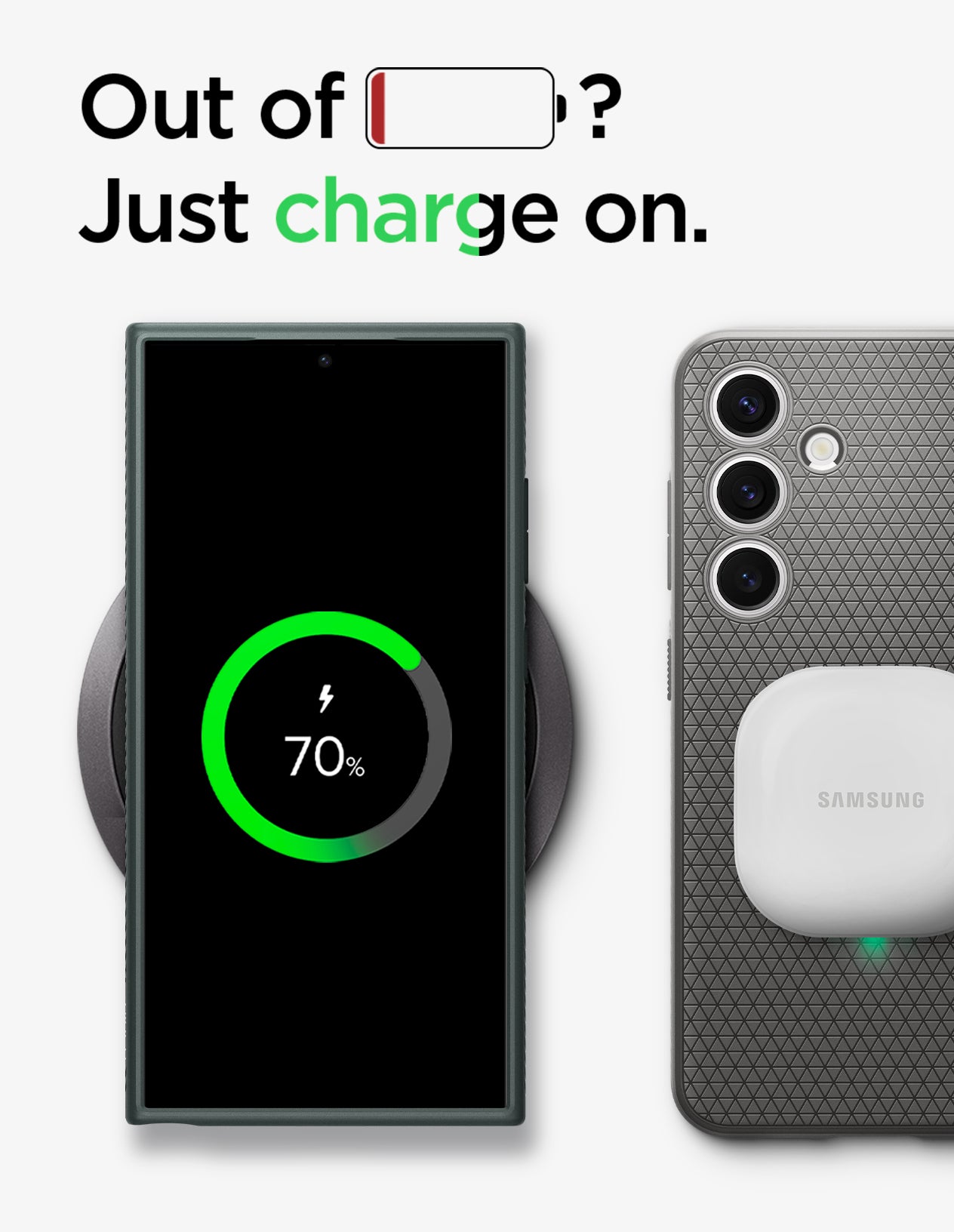 We know it’s a hassle to take the case off. So, simply charge on with the case on. Spigen cases are compatible with wireless charger.