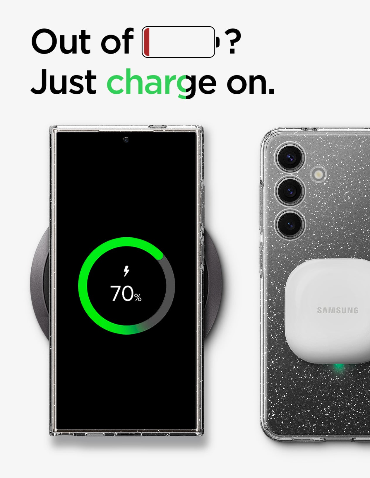 We know it’s a hassle to take the case off. So, simply charge on with the case on. Spigen cases are compatible with wireless charger.