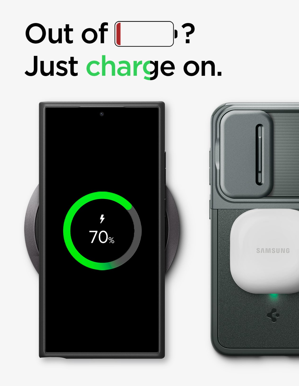 We know it’s a hassle to take the case off. So, simply charge on with the case on. Spigen cases are compatible with wireless charger.